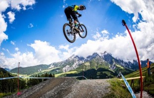 Немного прокатившись траверсом вдоль нижнего яруса пещер, мы увидели этот спуск. Очень крутой, почти полностью лишенный растительности 300-метровый склон, усыпанный похожей на осколки черепицы каменной крошкой и щедро припудренный известковой пылью. Женя поехал первым, а мы внимательно смотрели за его действиями и траекторией. Я знаю, как Евгений катается, и могу честно сказать, что таким осторожным во время спуска видеть его мне не доводилось… Особенно завораживающим стал момент, когда наш гид свернул со спускающейся траверсом тропы и отправился «по фрирайду» прямо вниз по склону, поднимая тучи пыли.